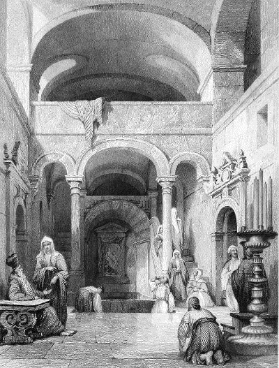 But the crowds congregated about the sacred well were far more seriously engaged: various “impotent folk, of blind, halt, and withered,” were placed near the waters, like those of the pool of Bethesda, brought there to be healed. They lay stretched on carpets or blankets, on which all the pious who passed, threw money, till the patient and his bed were spangled over with paras. In different parts of the ruined edifice were priests in their richest vestments, who displayed the most celebrated and wonder-working relics of their church on shrines erected for the purpose, and supported, in both their hands, capacious silver dishes, which were filled with the contributions of the crowd. But the ardour and enthusiasm of the devotees who repaired to the well for health exceeded all belief. Priests stood around the Spring with pitchers in their hands, which they constantly filled, and handed up to those about them. They were eagerly seized by every person who could catch them, and poured with trembling emotion on their heads and breasts, where they were rubbed, so that every particle of the health-giving fluid might be imbibed by the pores of the skin; while those who could not pay for, and were not favoured with this precious ablution eagerly caught at the stray drops with their hands, and applied them reverently to their faces and bosoms. Occasionally, a frighted fish darted across the bottom of the well; and when a glance of this fried phenomenon was caught by the crowd, a shout of exultation was raised, followed by a low murmur of praise and thanksgiving for the miracle.