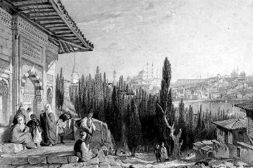 Connected with this edifice was the celebrated “Chrysopule,” or golden gate, so renowned for its splendour under the Greek empire. It opened into the area, and was one of the entrances to the Seven Towers. It was covered with some beautiful sculptures in basso-relievo, which were considered chef-d’œuvres of art, and among them Venus holding her torch over the sleeping Adonis, to examine his beauties. Its position is on the right of the illustration. In the distance is the romantic archipelago of the Princess’ Islands, on one side, and on the other, the promontory of Scutari.