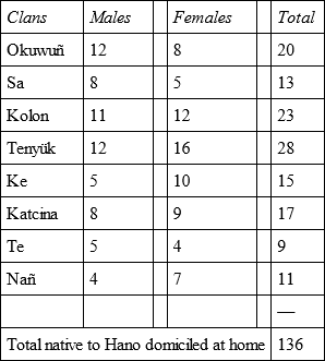 Census of Hano by ClansOkuwuñ-towa, or Rain-cloud clan. – Men and boys: Kalakwai, Kala, Tcüa, Wiwela, Kahe, Yane, Solo, Yunci, Pade, Klee, Kochayna, Këe (12). Women and girls: Sikyumka, Kwentce, Talitsche, Yoyowaiolo, Pobitcanwû, Yoanuche, Asou, Tawamana (8). Total, 20.