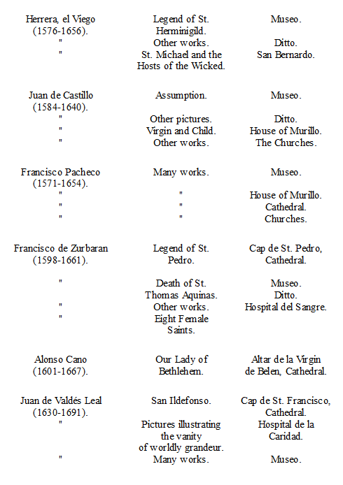 The degraded Italian taste was carried to its uttermost limits by Herrera El Mozo (the younger), 1622-1625, who, by a strange anomaly, was the son of the man, who was the first to break completely away from the trammels of the pseudo-Italian manner. His works may be viewed in the Cathedral and the Museo; they instance the degradation which had been brought upon the art of Seville, by the unintelligent adoption of an alien style.