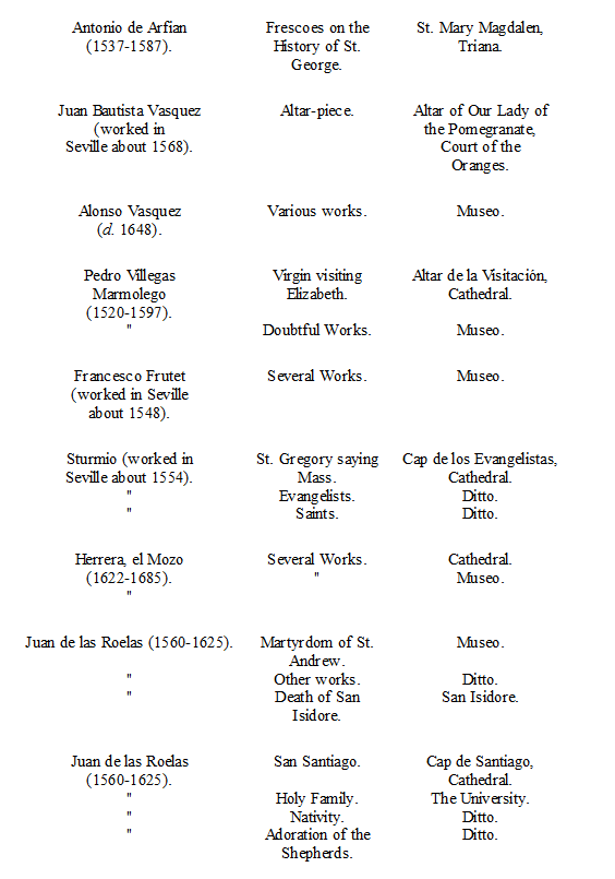 More individuality is revealed in the works of Pedro Villegas Marmolego, 1520-1597, an artist whose pictures are extremely rare. The Virgin visiting Elizabeth, which hangs over the Altar de la Visitación in the Cathedral, is a good example of his work, and displays his charm as a colourist. The garments of both the Virgin and Elizabeth are beautiful with radiant harmony. The works of Francesco Frutet – like Campaña a Flemish artist trained in Italy, who came to Seville, about the year 1548 – will be noticed in the account of the Museo.