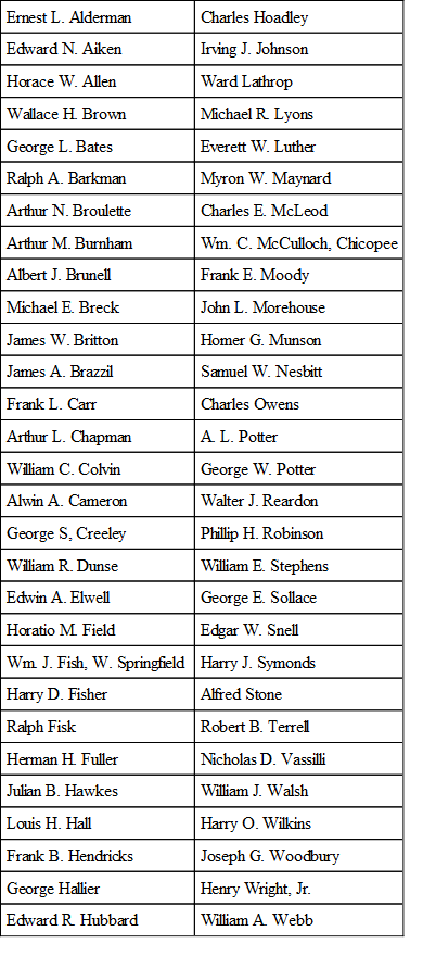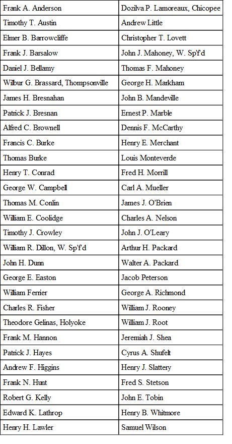 Since the muster-out three more of Springfield's contingent, all K company men, have answered the final roll call. Corporal Thomas C. Boone died in Massachusetts general hospital at Boston, March 19, 1899, and Private Michael R. Lyons at Springfield, April 20. Private George C. Creley died June 25, at his home after a long illness. Private John L. Morehouse died in Springfield, November 12, 1889.