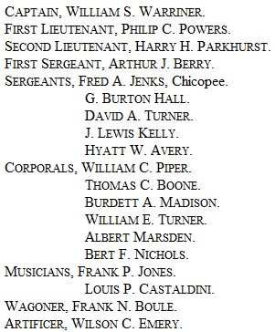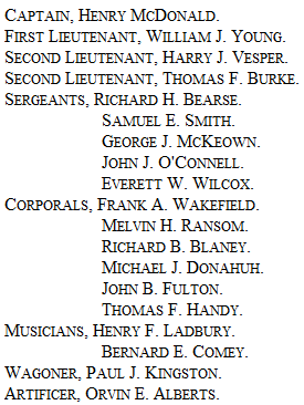 Sergeant-Major, Robert N. Ingersol. Quartermaster-Sergeant, Ross L. Lusk. Hospital Steward, Edson P. Howes.