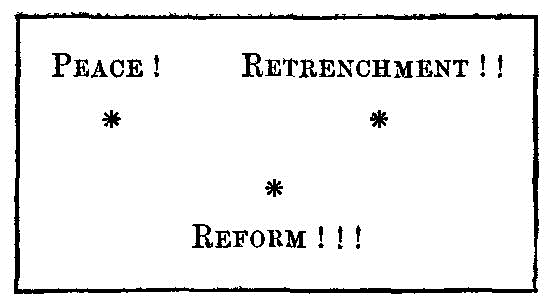 (being the, "Three Polar Stars" spoken of in Mr. Titmouse's Address,) and the words—"Peace! Retrenchment!! Reform!!!" in immense gilt letters. The walls and windows of each were, moreover, covered with varicolored placards—but I shall not weary the reader by attempting to describe in detail the humors of a country election, which have employed, already, thousands of able and graphic pens and pencils. Surely, what else are they than the sticks and straws which float along the eddying and roughened surface? The whole mass of water is moving along; and our object should be rather to discover its depth, force, and direction. Principles are in conflict; the fate of the nation is, in a measure, involved in a popular election. Such matters as I have alluded to, are but the laughable devices resorted to, in order to delude the grinning vulgar, and disguise the movements of those calm and calculating persons who are playing the deep game of politics. Under cover of a ludicrous hubbub, might be observed, for instance, in this little borough—subject to certain petty local disturbing forces—a deadly struggle for ascendency between the monarchical and the democratical principle; between rampant innovation and obstinate immobility; between the wealthy few and the many poor; between property and ability. If anything like this were the case, how many of the electors—new or old—of Yatton—(who may perhaps be compared to chessmen in the hands of long-headed players)—knew any more about the matter than a private soldier at Waterloo thought of, comprehended, or appreciated, the complicated and mighty schemes of a Wellington or Napoleon, whose bidding he was doing, or of the prodigious consequences attached to the success or failure of either? Some people talk vehemently about the "paramount necessity for educating the lower classes." It is, indeed, of incalculable importance that they should be instructed; but is it not of still greater importance that the UPPER CLASSES should be instructed, if only on account of their being the holders of that PROPERTY, in greater or less proportions, with its inseparable power and influence, which, directly or indirectly, determines all the movements of the state? Could universal suffrage be supposed to exist consistently with the preservation of social order—of society—it would still be impossible to extirpate or effectually to counteract the influence of property, in whose hands soever it might be placed. Pluck out of the vilest of the bellowing bullies surrounding the hustings, him (of course a non-elector) most conspicuous for his insolence and brutality; imagine him suddenly or gradually become the owner of a great, or a small property, with the influence it gives him over customers, tenants, dependents: do you suppose that he will not at once, either gently or roughly, according to his temper, begin to exercise his power, (that which is so dear to the heart of man,) by dictating the exercise of the elective franchise on behalf of those political opinions which he may happen to favor? Is not THIS the man to instruct, and the better in proportion to the extent of his real influence? Except in those brief and horrid intervals of social convulsion, in which [Greek: dika kai panta palin strepetai], however popularized and extended may apparently be the system of electing parliamentary representatives, those who really return members to Parliament will—whether themselves actually electors or not, and whether directly or indirectly—be the holders of property, in villages, in towns, in cities, in boroughs and counties. The influence of property is, in truth, inevitable as that of gravitation: and losing sight of this, people may split their heads in vain, and chatter till the arrival of the Greek kalends, about extending farther and farther the elective franchise, shortening Parliaments, and voting by ballot. Whether it ought to be so, signifies little, when we know that it is, and will be so:—but now it is time to return to the Yatton election; and if I be but this once forgiven, I will not diverge again in a hurry from the main course of events.