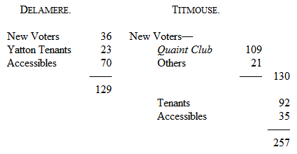 Mr. Crafty's first step was to ascertain what had been already done or attempted on behalf of Mr. Delamere, and also of Mr. Titmouse; then the exact number of the voters, whom he carefully classified. He found that there were exactly four hundred who might be expected to poll; the new electors amounting in number to one hundred and sixty, the old ones to two hundred and forty, and principally scot-and-lot voters. In due time he ascertained, that of the former class only thirty-six could be relied upon for Mr. Delamere. The tenants of the Yatton property within the borough amounted to one hundred and fifteen. They had been canvassed by Mr. Delamere and his friends with great delicacy; and twenty-three of them had voluntarily pledged themselves to vote for him, and risk all consequences; intimating that they hated and despised their new landlord as much as they had loved their old one, whose principles they understood to be those of Mr. Delamere. Then there remained a class of "accessibles," (to adopt the significant language of Mr. Crafty,) in number one hundred and twenty-five. These were persons principally resident in and near Yatton, subject undoubtedly to strong and direct influence on the part of Mr. Titmouse, but still not absolutely at his command. Of these no fewer than seventy had pledged themselves in favor of Mr. Delamere; and, in short, thus stood Mr. Crafty's calculations as to the probable force on both sides:—