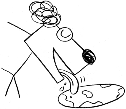 “Here, let me see,” said Poo-Poo, and he nudged his nose into a red splotch smeared across one section of the cardboard. He sniffed it, licked it, and then bit off a little piece and swirled it around in his mouth. He declared with great authority, “That red sticky stuff is delicious, no doubt. It has hints of salt and spice, and a fine, clean finish on the back of my palate. It evokes memories of tomato, green pepper, onion, and finely ground pepper.”
