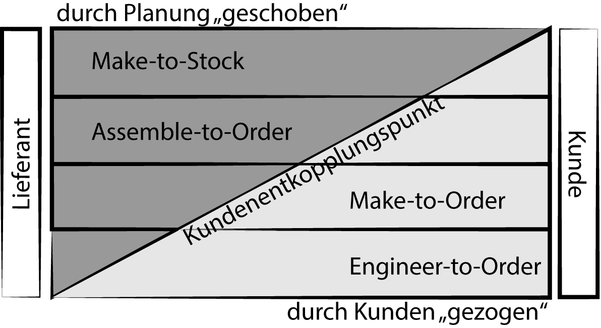 Ein für die Planung entscheidendes Kriterium ist der Kundenentkopplungspunkt. Dieser beschreibt einerseits, ab welchem Schritt in der Wertschöpfungskette der Kundenauftrag die Beschaffung »zieht«, ab wann also klar ist, für welchen Kunden etwas produziert wird. Andererseits definiert er, bis zu welchem Schritt die Beschaffung aus einer Vorplanung oder einer Prognose heraus »geschoben«, d. h. nur anonym produziert wird (siehe Abbildung 1.2).