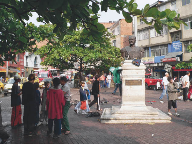 Die Plazoleta Rojas Pinilla ist ein kleiner Platz im Zentrum der lateinamerikanischen Millionenmetropole Medellín, der zweitgrößten Stadt Kolumbiens. In Form eines spitzen Dreiecks geschnitten, misst er an der Breitseite etwa vierzig, in der Länge wohl sechzig Meter. Man erfasst den Ort mit einem Blick: Um die Statue des ehemaligen kolumbianischen Präsidenten Rojas Pinilla herum findet eine wilde Jagd statt. Ein kleiner Junge hat einem Mädchen die Kleberflasche entrissen, und während er mit der einen Hand die empörte Verfolgerin abwehrt, versucht er mit der anderen, an der Flasche zu schnüffeln, vergebens. Unter einem der niedrigen Bäume mit ihren tellergroßen, schattenspendenden Blättern liegt eine Frau wie tot. Ein Junge wirft sich auf sie und küsst die Schlafende. Sie wacht auf, schreit und schlägt nach ihm. Vor einer Bar hält sich eine kleine Gruppe von Menschen auf, Erwachsene und Kinder. Zwei Polizisten, die ihr Motorrad am Straßenrand abgestellt haben, tasten jeden nach Waffen und Rauschgift ab, der wie ein Straßenbewohner aussieht. Ein junger Mann von dunkler Hautfarbe, dessen Beine bis auf zwei Stümpfe amputiert sind, ist, abgesehen von einer zerschlissenen Plastiktüte, die er wie eine Unterhose trägt, unbekleidet. So rutscht er erstaunlich schnell über den Platz, indem er sich mit den Armen voranrobbt. Dort, wo das Pflaster des Platzes aufgebrochen ist, verrichtet er seine Notdurft. Die Düfte des Marktes mischen sich mit denen von Kot, verfaultem Obst und Urin.