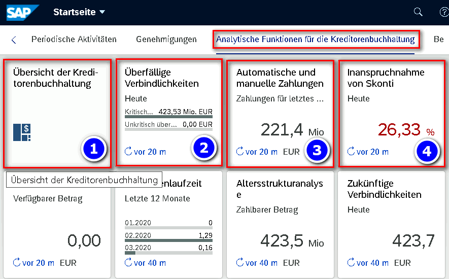 Hier möchten wir Ihnen nur einige der zahlreichen analytischen Apps aus dem Bereich der Kreditorenbuchhaltung vorstellen, die der Standardrolle Analytische Funktionen für die Kreditorenbuchhaltung zugeordnet sind (siehe Abbildung 2.7.