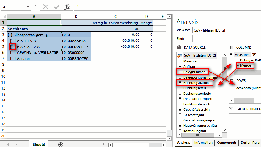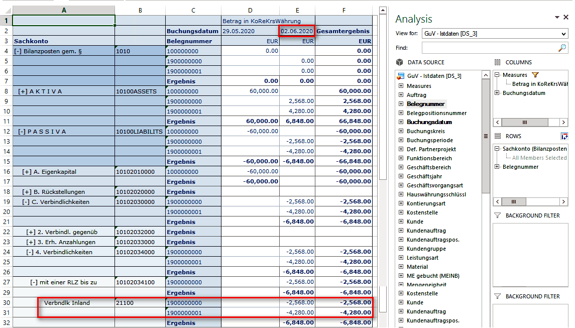 Der große Vorteil von Analysis und Excel ist, dass Sie beliebige Felder im Analysis-Fenster als Aufrissmerkmale in die Zeilen oder Spalten ziehen bzw. von dort wieder entfernen können. In dem hier gezeigten Beispiel haben wir mittels Drag-and-drop das Buchungsdatum in die Spalten und die Belegnummer in die Zeilen gezogen und die Menge wurde entfernt. Zudem wurden links die Passiva über das +-Zeichen bis zum bebuchten Konto 21100 – Verbindlichkeiten Inland aufgerissen. Das Ergebnis sehen Sie in Abbildung 2.10: Am 29.05.2020 wurden die Einlage des Stammkapitals und am 02.06.2020 die beiden Eingangsrechnungen auf das Konto 21100 gebucht.