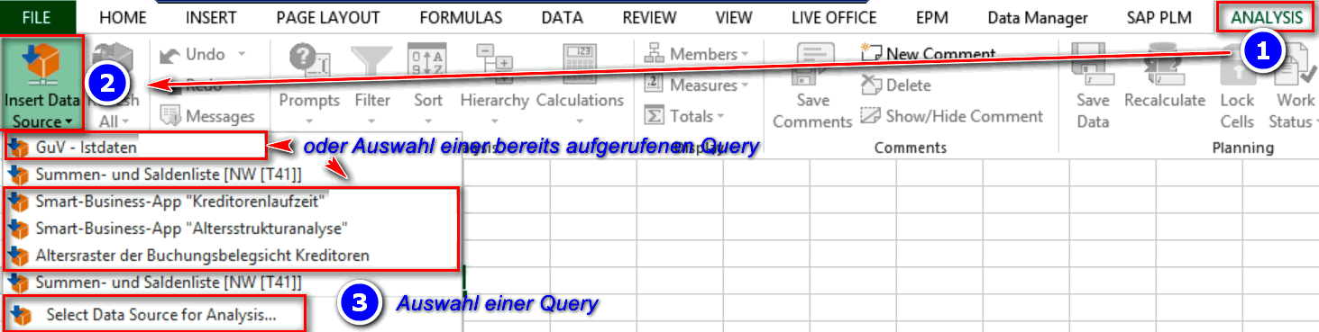 Mithilfe von SAP Analysis for Microsoft Excel können Sie SAP-Berichte direkt aus Excel heraus aufrufen und können so SAP und Excel in idealer Weise kombinieren. Die Berichte werden in diesem Zusammenhang auch als Queries bezeichnet. Sie können sowohl SAP-Standardberichte verwenden als auch Berichte selbst bzw. von Ihrer IT-Abteilung erstellen lassen.