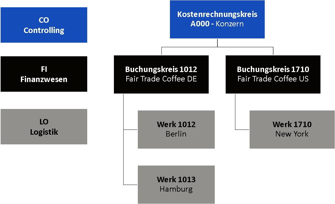 Zunächst haben wir für Zwecke des Controllings für den gesamten Konzern den Kostenrechnungskreis A000 angelegt. Da wir eine buchungskreisübergreifende Kostenrechnung wünschen, haben wir für die »Fair Trade Coffee GmbH« in Deutschland den Buchungskreis 1012 und für die »Fair Trade Coffee Ltd«. in den Vereinigten Staaten den Buchungskreis 1710 definiert sowie beide dem Kostenrechnungskreis A000 zugeordnet. Anschließend haben wir die Werke 1012 für Berlin, 1013 für Hamburg und 1710 für New York erstellt und dem jeweiligen Buchungskreis zugeordnet.
