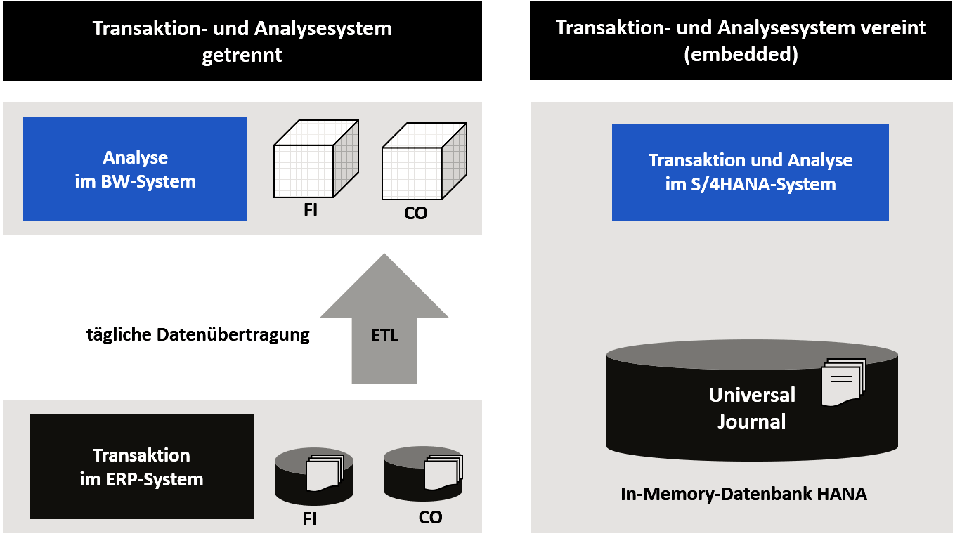In einem herkömmlichen ERP-System werden die gebuchten Werte meist täglich, bevorzugt in der Nacht, ins Business-Warehouse(BW)-System übertragen, um anschließend dort ausgewertet zu werden. In SAP S/4HANA können die Buchungen und Analysen im selben System erfolgen.
