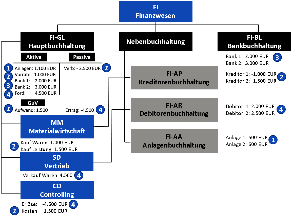 Der Kauf von Waren wird in der Hauptbuchhaltung (FI-GL) mit 1.000 EUR auf der Aktivseite unter Vorräte, der Kauf der Dienstleistung hingegen wird in der Gewinn- und Verlustrechnung als Aufwand und im Controlling (CO) als Kosten mit 1.500 EUR ausgewiesen.