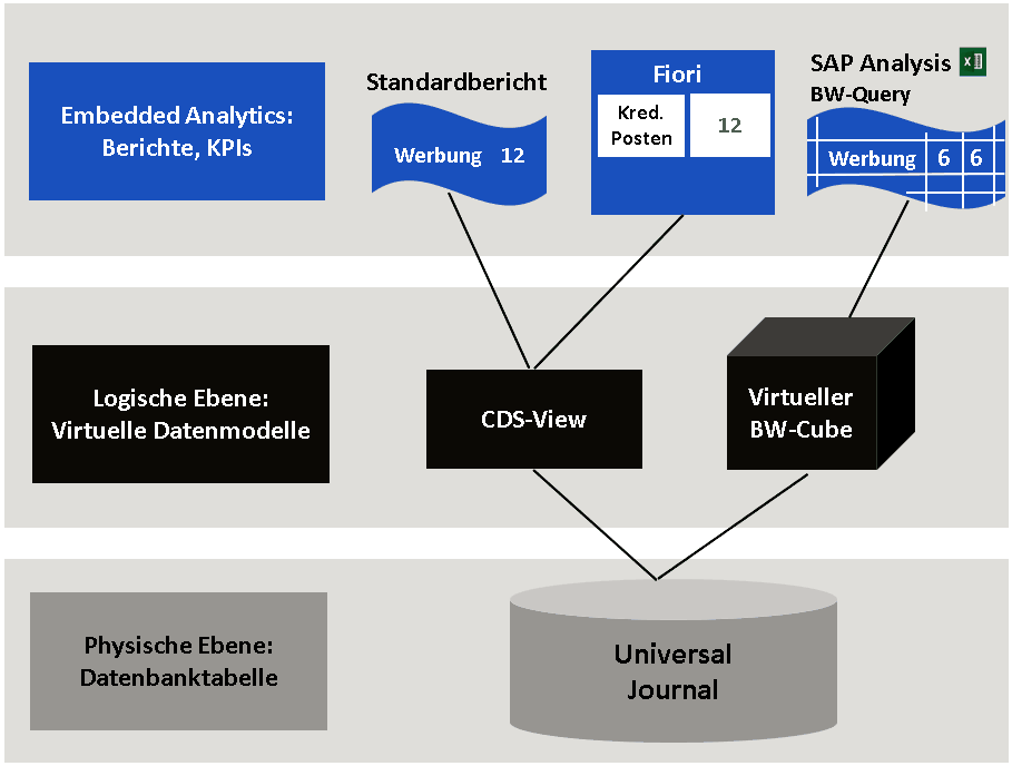 Die neue Logik ist so aufgebaut, dass zwischen der physischen Datenbankebene und den unterschiedlichen Berichtswerkzeugen ein virtuelles Datenmodell liegt, das aus sogenannten CDS-Views oder virtuellen BW-Infoprovidern bestehen kann. »Virtuell« bedeutet, dass die Daten kein weiteres Mal gespeichert werden.