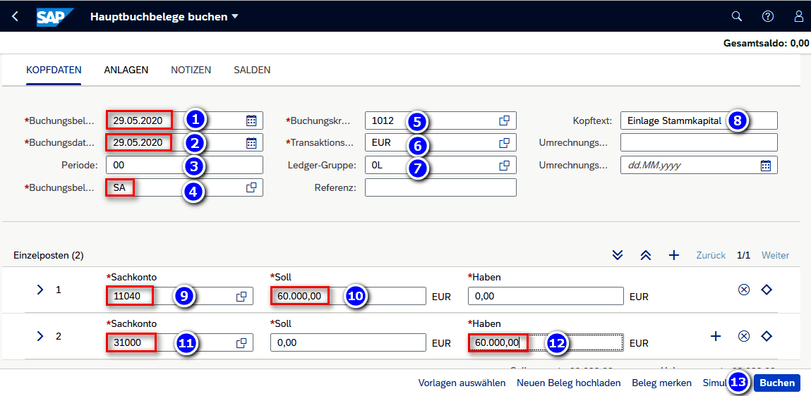 In Abbildung 3.6 sehen Sie die wichtigsten Felder für die Buchung der Einlage des Stammkapitals in der Eingabemaske hervorgehoben.