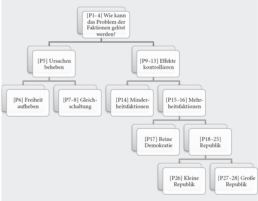 Die folgenden Paragrafen verfolgen zunächst den ersten Problemlösungsvorschlag und dann den zweiten. Wenn man das Übel an der Wurzel packen wolle und die Bildung von Faktionen verhindern möchte, könne dies nur dadurch geschehen, dass entweder die Freiheit der Bürger unterminiert wird oder alle Bürger dazu gebracht würden, dieselben Meinungen, Interessen und Leidenschaften zu teilen. Dieser erste Problemlösungsvorschlag wird daraufhin verworfen. Nimmt man sich stattdessen vor, nur die Auswirkungen des Problems zu regulieren, dann zeigt sich, dass das Problem im Rahmen einer Volksregierung tatsächlich nur bei Mehrheitsfaktionen besteht. Unterschiedliche Formen von Volksregierungen („reine Demokratien“ und „Republiken“) stellen wiederum unterschiedliche Möglichkeiten zur Regulierung der Effekte von Faktionen bereit, wobei auch die Anzahl der Bürger und die Größe des Territoriums relevante Faktoren seien. Die Diskussion wird durch die Aussage abgeschlossen, dass eine große Republik am Besten die Auswirkungen der Faktionen regulieren könne. Die Struktur der Gesamtargumentation des Texts, inklusive der Leitfrage der Untersuchung, kann damit wie folgt dargestellt werden: