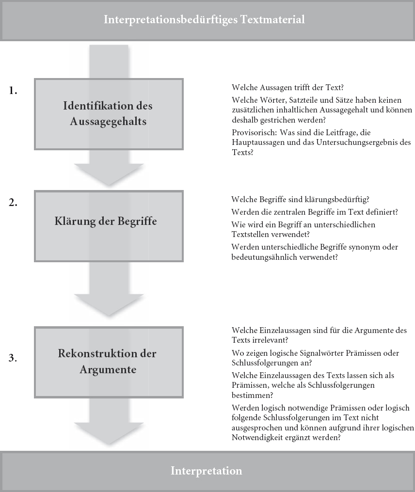 Wie ist vorzugehen, wenn man einen Text für interpretationsbedürftig oder, mit Blick auf den analytischen Ansatz, analysebedürftig befunden hat? Drei Analyseschritte lassen sich unterscheiden: Die Analyse des Aussagegehalts, die Klärung der Begriffe und die Rekonstruktion der Argumente des Texts.