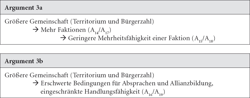 TextAussagenJe kleiner eine Gemeinschaft ist, umso geringer wird wahrscheinlich die Zahl der Parteien und Interessengruppen sein, aus denen sie sich zusammensetzt. Je geringer die Zahl der Parteien und Interessengruppen, um so eher wird eine Partei die Mehrheit erringen. Und je kleiner die Zahl der Individuen, die eine Mehrheit bilden, und je kleiner der Bereich, innerhalb dessen sie operieren, umso leichter werden sie zu einer Einigung gelangen und ihre Unterdrü ckungsabsichten ausfü hren können. Erweitert man den Bereich, so umschließt er eine größere Vielfalt an Parteien und Interessengruppen. Damit verringert sich die Wahrscheinlichkeit, daß eine Mehrheit ein gemeinsames Motiv hat, die Rechte anderer Bü rger zu verletzen. Wenn aber ein solches gemeinsames Motiv besteht, wird es fü r alle, die es teilen, schwerer, sich der eigenen Stärke bewusst zu werden und gemeinsam zu agieren. (P25)A14: Je kleiner das Territorium und die Anzahl der Bürger, desto weniger politische Splittergruppen. A15: Je weniger politische Splittergruppen, desto leichter kann eine Gruppierung zur Mehrheitsfaktion werden. A16: Je kleiner das Territorium und die Anzahl der Bürger, desto leichter können Allianzen geschmiedet werden. A17: Wh. A14. A18: Wh. A15. A19: Wh. A16.Die sechs Aussagen A14–A19, die zur Begründung der Behauptung dienen, dass Republiken aufgrund der größeren Spannweite des Territoriums und der Anzahl der Bürger Vorteile im Umgang mit Mehrheitsfaktionen gegenüber Reinen Demokratien haben, können auf drei reduziert werden, da die drei Vergleichssätze in der Form von drei Konditionalsätzen mit (nahezu) identischem propositionalen Gehalt wiederholt werden. Die Aussagen A14 und A15 (bzw. A17 und A18) liefern dabei eine Begründung, die Aussage A16 (bzw. A19) eine zweite.