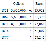Xeres de la Frontera (64,000), situated about thirty miles from Cadiz, surrounded by vineyards, is a city of Bodegas, or wine-cellars, the principal of which, as well as of the vineyards, are in the hands of foreigners. It is one of the busiest of Spanish commercial towns, and, like Barcelona, is on that account less peculiarly Spanish than many others. The exportation of sherry wines from the district, and those shipped at Port St. Mary, amounted, in 1873, to 98,924 butts; 1874, 65,365 butts; from Jerez alone, in 1875, 43,727 butts; 1876, 42,272 butts; 1877, 41,660 butts; 87 per cent, of which goes to Great Britain and her colonies. The decrease in later years is probably caused by the greater amount of lighter French wines now consumed in England. San Lucar de Barrameda (22,000), at the mouth of the Guadalquiver, is noted for its winter-gardens, which are said to date from Moorish times, and which supply Cadiz and Seville with their earliest fruits and vegetables. From its vineyards, too, comes the stomachic Manzanilla sherry, flavoured with the wild camomile, which grows abundantly in its vineyards. Arcos (12,000), on the Guadalete, is the only other Spanish town of importance in the province; but to the south lies the isolated rock and fortress of Gibraltar (25,000), captured by the Earl of Peterborough in 1704. Though held only as an English garrison (5000), and made almost impregnable as a fortress, it is yet of considerable commerce from its position as a port of call for vessels passing the Straits of Gibraltar, and also from its contraband trade with Spain, which is a source of constant irritation between the two nations. In natural history, it is remarkable for its apes (macacus inuus), as the only spot in Europe where any species of monkey lives, and it is doubtful whether even these would survive without the aid of occasional importations from Morocco.