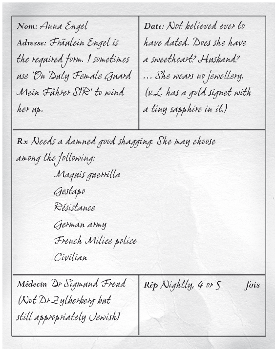 I am going to run out of stationery today. They have given me a Jewish prescription pad to use until they find something more sensible. I did not know such things existed. The forms have got the doctor’s name, Benjamin Zylberberg, at the top, and a yellow star with a warning stamped at the bottom, stating that this Jewish doctor can only legally prescribe medication to other Jews. Presumably he is no longer practising (presumably he has been shipped off to break rocks in a concentration camp somewhere), which is why his blank prescriptions have fallen into the hands of the Gestapo.
