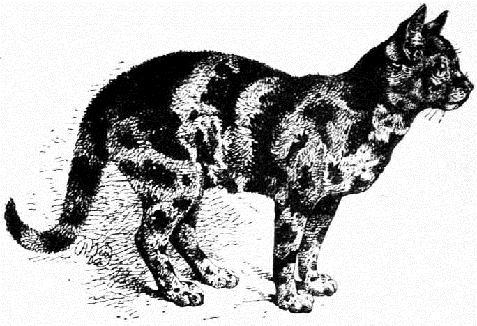 I now come to the section of the short-haired domestic cat, a variety possessing sub-varieties. Whether these all came from the same origin is doubtful, although in breeding many of the different colours will breed back to the striped or tabby colour, and, per contra, white whole-coloured cats are often got from striped or spotted parents, and vice versâ. Those that have had any experience of breeding domesticated animals or birds, know perfectly well how difficult it is to keep certain peculiarities gained by years of perseverance of breeding for such points of variation, or what is termed excellence. Place a few fancy pigeons, for instance, in the country and let them match how they like, and one would be quite surprised, unless he were a naturalist, to note the great changes that occur in a few years, and the unmistakable signs of reversion towards their ancestral stock—that of the Rock pigeon. But with the cat this is somewhat different, as little or no attempts have been made, as far as I know of, until cat shows were instituted, to improve any particular breed either in form or colour. Nor has it even yet, with the exception of the long-haired cats. Why this is so I am at a loss to understand, but the fact remains. Good well-developed cats of certain colours fetch large prices, and are, if I may use the term, perpetual prize-winners. I will take as an instance the tortoiseshell tom, he, or male cat as one of the most scarce, and the red or yellow tabby she-cat as the next; and yet the possessor of either, with proper care and attention, I have little or no doubt, has it in his power to produce either variety ad libitum. It is now many years since I remember the first "tortoiseshell tom-cat;" nor can I now at this distance of time quite call to mind whether or not it was not a tortoiseshell-and-white, and not a tortoiseshell pure and simple. It was exhibited in Piccadilly. If I remember rightly, I made a drawing of it, but as it is about forty years ago, of this I am not certain, although I have lately been told that I did, and that the price asked for the cat was 100 guineas.