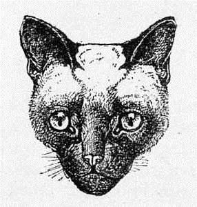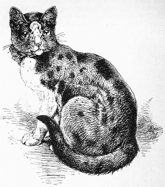 I now come to the last variety of the tabby cat, and this can scarcely be called a tabby proper, as it is nearly destitute of markings, excepting sometimes on the legs and a broad black band along the back. It is mostly of a deep brown, ticked with black, somewhat resembling the back of a wild (only not so gray) rabbit. Along the centre of the back, from the nape of the neck to the tip of the tail, there is a band of black, very slightly interspersed with dark brown hairs. The inner sides of the legs and belly are more of a rufous-orange tint than the body, and are marked in some cases with a few dark patches; but they are best without these marks, and in the exhibition pens it is a point lost. The eyes are deep yellow, tinted with green; nose dark red, black-edged; ears rather small, dark brown, with black edges and tips; the pads of the feet are black. Altogether, it is a pretty and interesting variety. It has been shown under a variety of names, such as Russian, Spanish, Abyssinian, Hare cat, Rabbit cat, and some have gone so far as to maintain that it is a cross between the latter and a cat, proving very unmistakably there is nothing, however absurd or impossible, in animal or everyday life, that some people are not ready to credit and believe. A hybrid between the English wild cat and the domestic much resembles it; and I do not consider it different in any way, with the exception of its colour, from the ordinary tabby cat, from which I have seen kittens and adults bearing almost the same appearance. Some years ago when out rabbit-shooting on the South Downs, not far from Eastbourne, one of our party shot a cat of this colour in a copse not far from the village of Eastdean. He mistook it at first for a rabbit as it dashed into the underwood. It proved not to be wild, but belonged to one of the villagers, and was bred in the village. When the ground colour is light gray or blue, it is generally called chinchilla, to the fur of which animal the coat has a general resemblance. I have but little inclination to place it as a distinct, though often it is of foreign breed; such may be, though ours is merely a variety—and a very interesting one—of the ordinary tabby, with which its form, habits, temper, etc., seem fully to correspond; still several have been imported from Abyssinia all of which were precisely similar, and it is stated that this is the origin of the Egyptian cat that was worshipped so many centuries ago. The mummies of the cats I have seen in no case had any hair left, so that it was impossible to determine what colour they were. The imported cats are of stouter build than the English and less marked. These bred with an English tabby often give a result of nearly black, the back band extending very much down the sides, and the brown ticks almost disappearing, producing a rich and beautiful colouring.