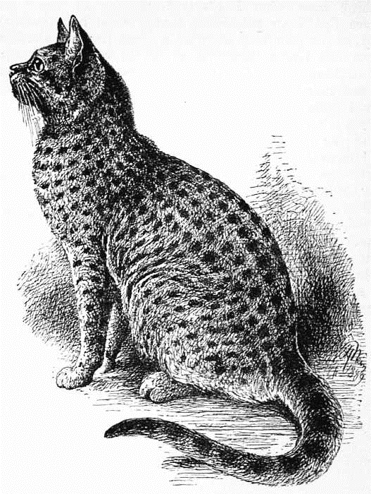 In the brown-spotted tabby, the dark gray-spotted tabby, the black-spotted tabby, the gray or the blue-spotted tabby, the eyes are best yellow or orange tinted, with the less of the green the better. The nose should be of a dark red, edged with black or dark brown, in the dark colours, or somewhat lighter colour in the gray or blue tabbies. The pads of the feet in all instances must be black. In the yellow and the red tabby the nose and the pads of the feet are to be pink. As regards the tail, that should have large spots on the upper and lower sides instead of being annulated, but this is difficult to obtain. It has always occurred to me that the spotted tabby is a much nearer approach to the wild English cat and some other wild cats in the way of colour than the ordinary broad-banded tabby. Those specimens of the crosses, said to be between the wild and domestic cat, that I have seen, have had a tendency to be spotted tabbies. And these crosses were not infrequent in bygone times when the wild cats were more numerous than at present, as is stated to be the case by that reliable authority, Thomas Bewick. In the year 1873, there was a specimen shown at the Crystal Palace Cat Show, and also the last year or two there has been exhibited at the same place a most beautiful hybrid between the East Indian wild cat and the domestic cat. It was shown in the spotted tabby class, and won the first prize. The ground colour was a deep blackish-brown, with well-defined black spots, black pads to the feet, rich in colour, and very strong and powerfully made, and not by any means a sweet temper. It was a he-cat, and though I have made inquiry, I have not been able to ascertain that any progeny has been reared from it, yet I have been informed that such hybrids between the Indian wild cat and the domestic cat breed freely.