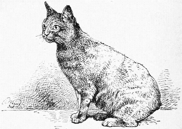 The Manx cat is well known, and is by no means uncommon. It differs chiefly from the ordinary domestic cat in being tailless, or nearly so, the best breeds not having any; the hind legs are thicker and rather longer, particularly in the thighs. It runs more like a hare than a cat, the action of the legs being awkward, nor does it seem to turn itself so readily, or with such rapidity and ease; the head is somewhat small for its size, yet thick and well set on a rather long neck; the eyes large, round, and full, ears medium, and rather rounded at the apex. In colour they vary, but I do not remember to have seen a white or many black, though one of the best that has come under my notice was the latter colour. I have examined a number of specimens sent for exhibition at the Crystal Palace and other cat shows, and found in some a very short, thin, twisted tail, in others a mere excrescence, and some with an appendage more like a knob. These I have taken as having been operated upon when young, the tail being removed, but this may not be the case, as Mr. St. George Mivart in his very valuable book on the cat, mentions a case where a female cat had her tail so injured by the passage of a cart-wheel over it, that her master judged it best to have it cut off near the base. Since then she has had two litters of kittens, and in each litter one or more of the kittens had a stump of tail, while their brothers and sisters had tails of the usual length. But were there no Manx cats in the neighbourhood, is a query. This case is analogous to the statement that the short-tailed sheep-dog was produced from parents that had had their tails amputated; and yet this is now an established breed. Also a small black breed of dogs from the Netherlands, which is now very fashionable. They are called "Chipperkes," and have no tails, at least when exhibited. Mr. St. George Mivart further states that Mr. Bartlett told him, as he has so stated to myself, that in the Isle of Man the cats have tails of different lengths, from nothing up to ten inches. I have also been informed on good authority that the Fox Terrier dogs, which invariably have (as a matter of fashion) their tails cut short, sometimes have puppies with much shorter tails than the original breed; but this does not appear to take effect on sheep, whose tails are generally cut off. I cannot, myself, come to the same conclusion as to the origin of the Manx cat. Be this as it may, one thing is certain: that cross-bred Manx with other cats often have young that are tailless. As a proof of this, Mr. Herbert Young, of Harrogate, has had in his possession a very fine red female long-haired tailless cat, that was bred between the Manx and a Persian. Another case showing the strong prepotency of the Manx cat. Mr. Hodgkin, of Eridge, some time ago had a female Manx cat sent to him. Not only does she produce tailless cats when crossed with the ordinary cat, but the progeny again crossed also frequently have some tailless kittens in each litter. I have also been told there is a breed of tailless cats in Cornwall. Mr. Darwin states in his book on "The Variation of Animals and Plants under Domestication," vol. i. p. 47, that "throughout an immense area, namely, the Malayan Archipelago, Siam, Pequan, and Burmah, all the cats have truncated tails about half the proper length, often with a sort of knob at the end." This description tallies somewhat with the appearance of some of the Siamese cats that have been imported, several of which, though they have fairly long and thin tails, and though they are much pointed at the end, often have a break or kink. In a note Mr. Darwin says, "The Madagascar cat is said to have a twisted tail." (See Desmares, in Encyclop. Nat. Mamm., 1820, p. 233, for some other breeds.) Mr. St. George Mivart also corroborates the statement, so far as the Malay cat is concerned. He says the tail is only half the ordinary length, and often contorted into a sort of knot, so that it cannot be straightened. He further states, "Its contortion is due to deformity of the bones of the tail," and there is a tailless breed of cats in the Crimea. Some of the Manx cats I have examined have precisely the kind of tail here described—thin, very short, and twisted, that cannot be straightened. Is it possible that the Manx cat originated from the Malayan? Or rather is it a freak of nature perpetuated by selection? Be this as it may, we have the Manx cat now as a distinct breed, and, when crossed with others, will almost always produce some entirely tailless kittens, if not all. Many of the Siamese kittens bred here have kinks in their tails.