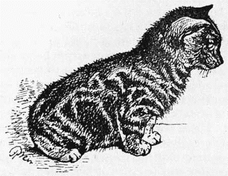 The illustration I give is that of a prize winner at the Crystal Palace in 1880, 1881, 1882, and is the property of Mr. J. M. Thomas, of Parliament Street. In colour it is a brindled tortoiseshell. It is eight years old. At the end of this description I also give a portrait of one of its kittens, a tabby; both are true Manx, and neither have a particle of tail, only a very small tuft of hair which is boneless. The hind quarters are very square and deep, as contrasted with other cats, and the flank deeper, giving an appearance of great strength, the hind legs being longer, and thicker in proportion to the fore legs, which are much slighter and tapering; even the toes are smaller. The head is round for a she-cat, and the ears somewhat large and pointed, but thin and fine in the hair, the cavity of the ear has less hair within it (also a trait of the Siamese) than some other short-haired cats, the neck is long and thin, as are the shoulders. Its habits are the same as those of most cats. I may add that Mr. Thomas, who is an old friend of mine, has had this breed many years, and kept it perfectly pure.