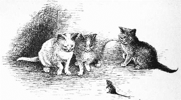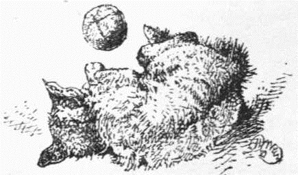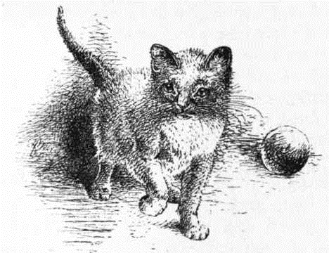 Kittenhood, the baby time especially of country cats, is with most the brightest, sprightliest, and prettiest period of their existence, and perhaps the most happy. True, when first born and in the earliest era of their lives, they are blind, helpless little things, dull, weak, and staggering, scarcely able to stand, if at all, almost rolling over at every attempt, making querulous, fretful noises, if wakeful or cold, or for the time motherless. But 'tis not for long; awhile, and she, the fondest of mothers, is with them. They are nestled about her, or amid her soft, warm fluffy fur, cossetted with parental tenderness, caressed, nurtured, and, with low, sweet tones and fondlings, they are soothed again and again to sleep.—They sleep.—Noiseless, and with many a longing, lingering look, the careful, watchful, loving creature slowly and reluctantly steals away; soon to return, when she and her little ones are lost "in the land of dreams." And so from day to day, until bright, meek-eyed, innocent, inquiring little faces, with eager eyes, peep above the basket that is yet their home. One bolder than the others springs out, when, scared at its own audacity, as quickly, and oft clumsily, scrambles back, then out—in—and out, in happy, varied, wild, frolicsome, gambolsome play, they clutch, twist, turn, and wrestle in artless mimicry of desperate quarrelling;—the struggle over, in liveliest antics they chase and rechase in turn, or in fantastic mood play; 'tis but play, and such wondrous play—bright, joyous, and light; and so life glides on with them as kittens—frisky, skittish, playful kittens.