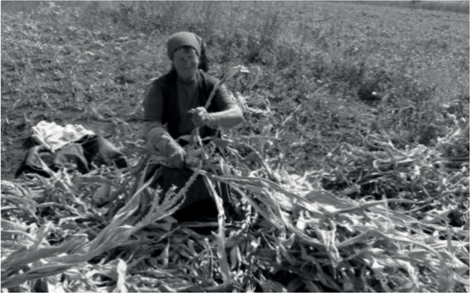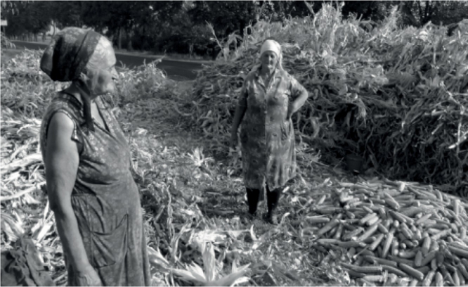 Frauen sind mit der Maisernte und Bergung dieser beschäftigt