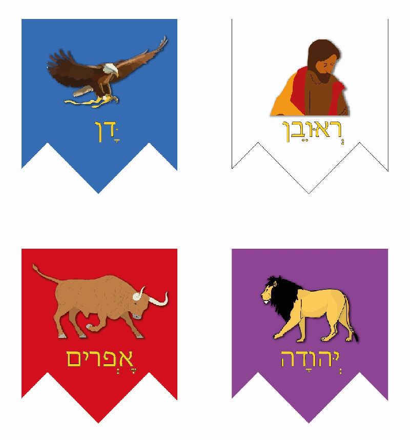 In den folgenden Darstellungen können wir erkennen, wie die Banner aussahen und wie sie um die Stiftshütte herum platziert waren, als Israel sich in der Wüste befand.