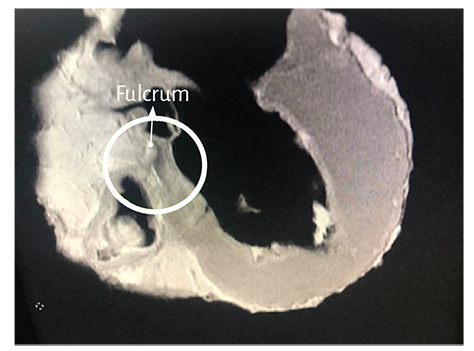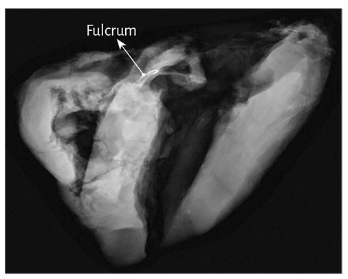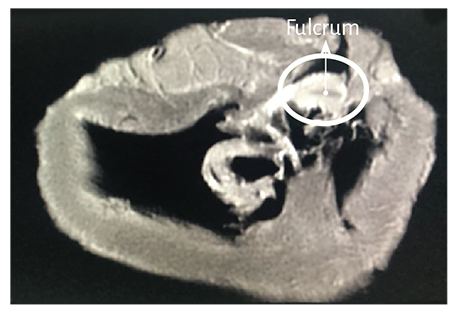 Our interpretation is that perhaps the osseous fulcrum is a vestigial organ specific of mammalian evolution. A vestigial structure must be understood as the preservation during the evolutionary process of genetically established attributes which have lost all or part of their ancestral function in a certain species. (45) As a result, it is found in the initial process of human gestation, but later loses its osseous character, remaining as a tendinous matrix able to achieve myocardial band insertion to attain a muscle power which is much lower than that of larger mammals. Recall that in bovids the fulcrum found in this investigation is of bone nature (Figures 1.28 to 1.30).