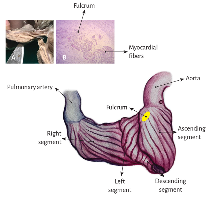 Figure 1.27. The drawing shows the myocardial band arrangement at the beginning of its unfolding. The pulmonary artery and the right segment have been separated from the fulcrum to show its intermediate location between the right segment (anterior location) and the ascending segment (posterior location). A: macroscopic image of the fulcrum in the adult human heart. B: microscopic image of the human fulcrum. Notice the myocardial fibers inserting into the tendinous fulcrum matrix