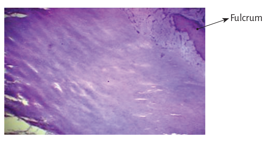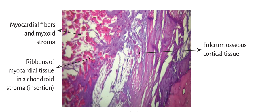 However, the histological analysis of the fulcrum in adult human hearts evidenced a tendinous collagenous matrix, needing an additional clarification. In principle, there is constancy in the detection, site and morphology of the fulcrum in all the hearts analyzed. This means that from a functional point of view, its presence is akin to myocardial band insertion, as established in the histological analysis, becoming a solid point of interpretation to achieve its biomechanical function. And we find this demonstration when the histological examination is directed to the myocardial insertion in the osseous, chondroid or tendinous fulcrum. All the hearts studied presented this myocardial attachment to the rigid structure of the fulcrum, integrating a cardiomyocyte-matrix unit, regardless of its osseous, cartilaginous or tendinous nature (Figures 1.33 to 1.38).