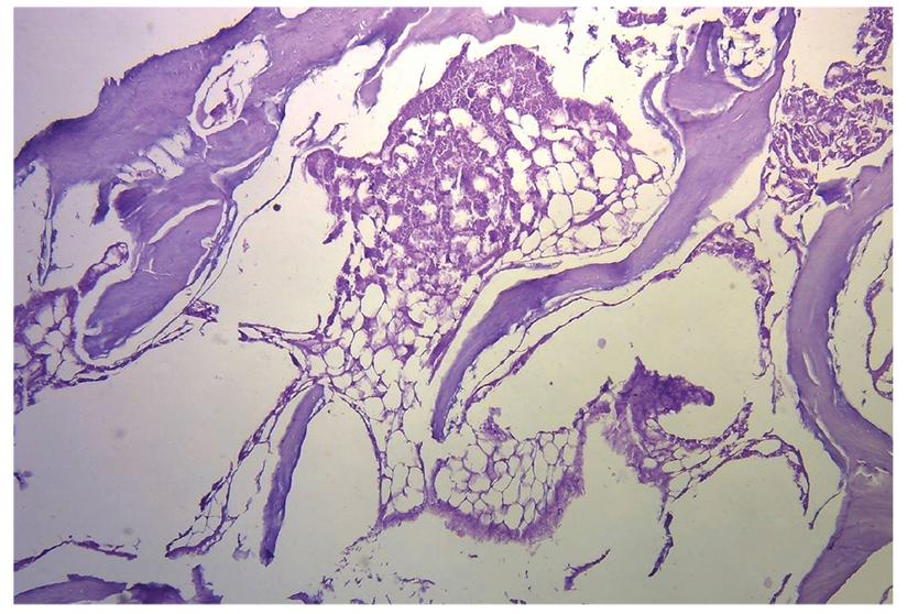 Figure 1.30. Cardiac fulcrum trabecular bone with osteoblasts and segmental lines. The structure constitutes the trabecular bone tissue scaffolding similar to the metaphyseal area of growth in long bones. The histological section also shows bone trabeculae with osteoblasts and segmental lines secondary to bone apposition (bovine heart). Hematoxylin-eosin stain at high magnification (40×).