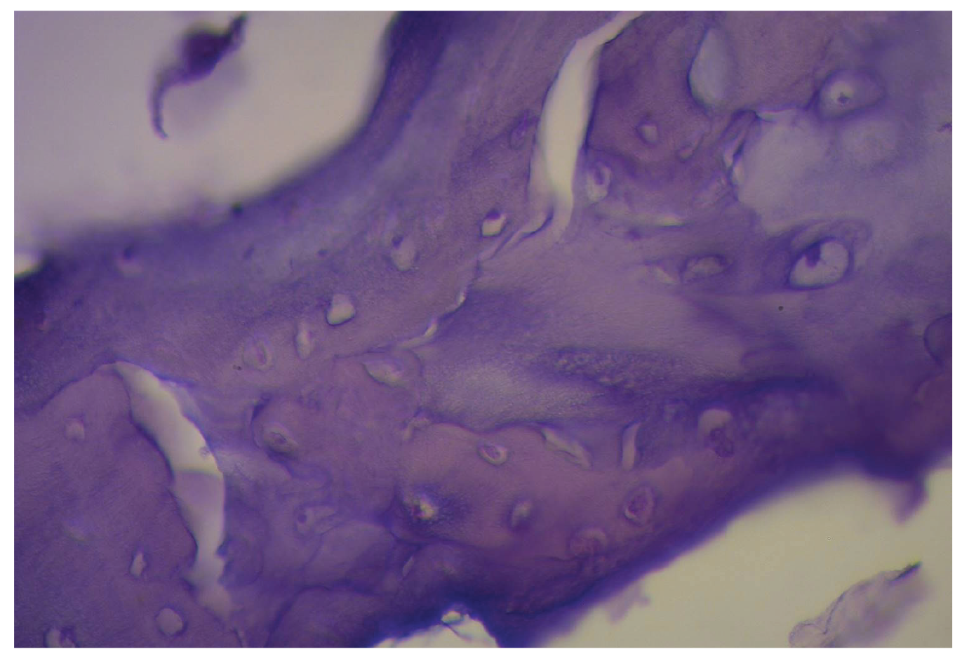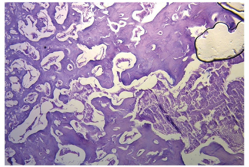 Figure 1.28. Histological section of the cardiac fulcrum showing trabecular bone tissue with osteologic segmental lines (bovine heart). Hematoxylin-eosin stain.
