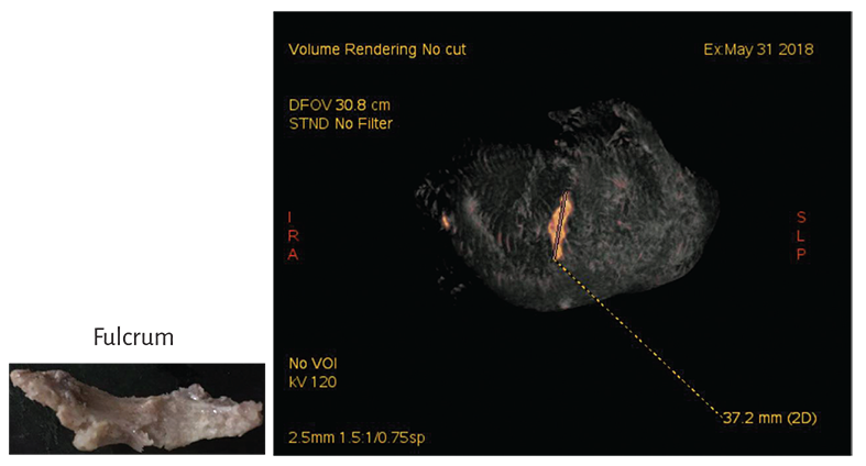 Fulcrum imaging studies. Bovine hearts studied with computed tomography (Figures 1.40 to 1.42), magnetic resonance imaging (Figures 1.43 and 1.44) and X-rays (Figure 1.45) identified the osteochondral nucleus found in dissection, with the same morphology and analogous size.
