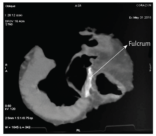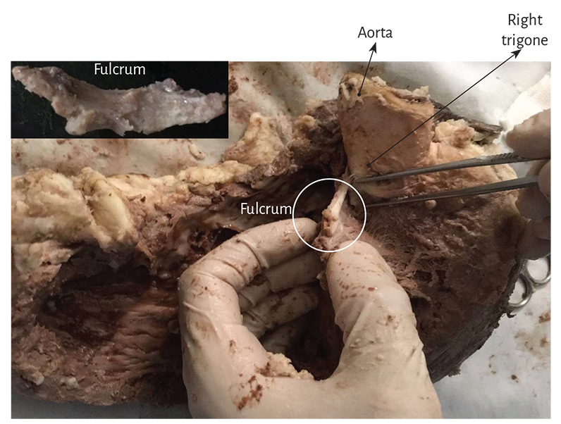 The cardiac fulcrum is adjacent and anteroinferior to the right trigone, constituting a solid, homogeneous structure to palpation with osseous, chondroid or tendinous histology. It is the site where the right segment and the ascending segment fibers attach, origin and end of the myocardial band. These insertions must be understood as the supporting point of the myocardial band to fulfill its hemodynamic function.