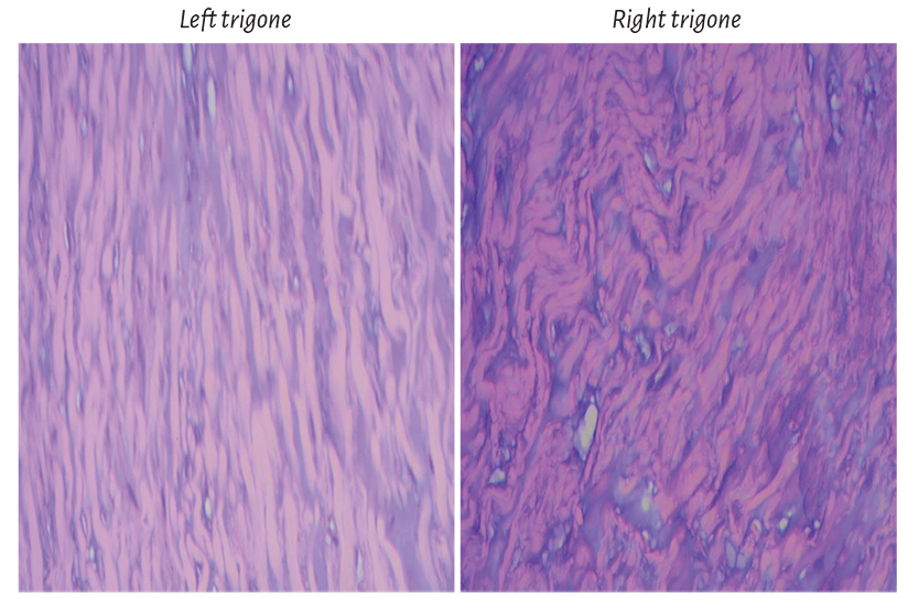 A histological analysis has also been carried out on the trigones trying to find cardiomyocytes in them, as a possibility of insertion of the band in these structures. In our investigation, only collagen tissue was observed without cardiomyocytes in the trigones, confirming that the fulcrum is the support of the band, both in its beginning and in its termination (Figure 1.39).