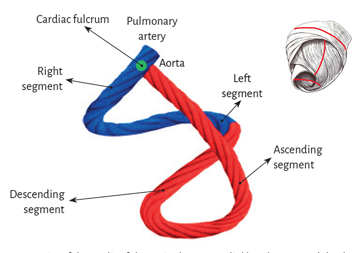 Figure 1.46. Site of the cardiac fulcrum in the myocardial band (rope model). The inset shows (in red) the schematic diagram of the rope model overlapping with the myocardium.