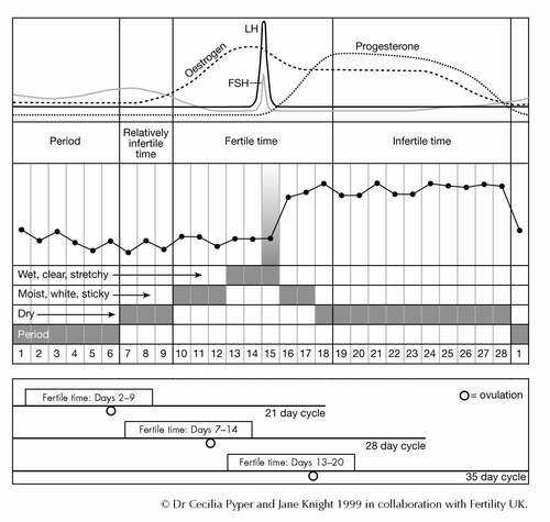 Immediately after a period you may notice one or more dry days – when no secretions can be seen or felt (these days are not likely to be fertile). As soon as the secretions start, this means that the cervix is preparing to accept sperm and you are into the start of your fertile time. At first the secretions will feel slightly sticky and be white or creamy in colour, then they’ll gradually change to become cloudy and wetter, then more transparent and sometimes quite slippery and stretchy – the highly fertile sperm – friendly secretions. After ovulation the secretions change back to being thicker, more sticky and white again, then back to dry again in the run – up to your next period. As a quick ‘rule of thumb’, if you feel wet – have lots of sex!