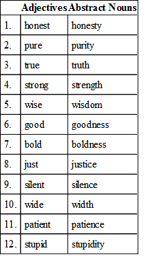 64. You remember we found in the study of adjectives that we have a class of adjectives which are used to describe the qualities of objects, as for example—good, noble, honest, true, wise, etc. Since abstract nouns are the names of qualities, many of our abstract nouns are formed from adjectives. Study carefully the following list of adjectives and nouns. Note that the word is an adjective when it is used with a noun to describe certain qualities. It is a noun when it is used by itself to name that quality.