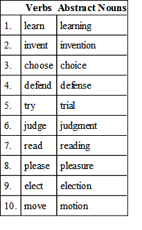 65. You will notice that another use of abstract nouns is to name actions. The verb is the part of speech which expresses action, therefore many abstract nouns are formed from verbs. Notice the following list:
