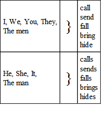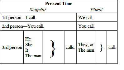 106. Now note, in the above table, that there is only one form change in the verb, and this is in the third person singular. We say I call, You call, We call, They, or The men call, but we say He, or the man calls, in speaking of one person or thing. So we change the form of the verb with any subject which denotes the third person and the singular number. This form is made by adding s to the simple form of the verb, therefore we may call it the s-form because it always ends in s.