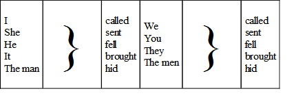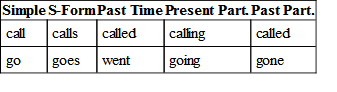 Notice that these various forms of the verb which express past time are all made by changes from the simple form, which expresses present time. You will also notice that these five verbs used in the above table all form their past time form in different ways. For example, call adds ed; send changes the final letter from d to t; fall changes the vowel in the middle of the word from a to e; bring changes both the vowel and the final letter from bring to brought; hide drops the final letter e.