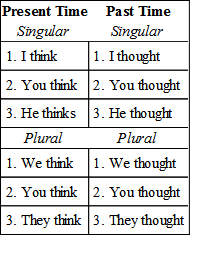 What is the difference in the meaning of I think and I thought? of I work and I worked? When we say, I think, or I work, we mean that the action is now, to-day, in the present; but when we say, I thought, or I worked, we mean that now is not the time of the action, but that the action was performed sometime in the past. So we have a change in the verb form to denote time. The simple form of the verb, like think or work, is used to denote present time. When we wish to express past time we do it by changing the form of the verb. Now note the following: