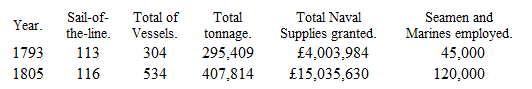 At this stage of our story it may not be unfitting to study the accompanying table,15 which reveals at a glance the active list of ships, exclusive of harbour and stationary vessels, troop and storeships, ships building, etc., in the British Navy, at the beginning of the Great War and in 1805: