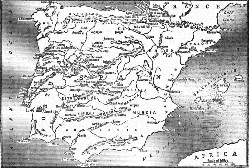 The inhabitants of the Asturias, in the north, were the first of the provincials to apply the torch to the tinder of revolt, after a riot in Madrid on the 2nd May 1808, and its Junta General called into being a levy of 18,000 men to protect the principality. It sent two deputies to England for assistance, which was readily given in money and military stores. Other provinces likewise selected Juntas, and Galicia also dispatched representatives to plead its cause in London. Galicia, adjoining the Asturias on the west, lost little time in following the warlike example of its neighbours, and the arsenals of Coruña and Ferrol, made memorable by the Trafalgar campaign, threw in their lot against Napoleon and contributed no fewer than thirty-two battalions of regulars and militia to the general forces. Leon and Old Castile also rose in rebellion, though with less energy. There were too many French in the Basque Provinces and Navarre for much to be attempted there. Coming still farther to the east, Catalonia sheltered 16,000 regulars and many irregular levies, but Aragon, Valencia, and Murcia were very weak. Andalusia, in the extreme south of the country, was almost as fortunately placed with regard to troops as Galicia, and the remains of the French fleet which had escaped Nelson and Collingwood were taken as they rode in Cadiz harbour.